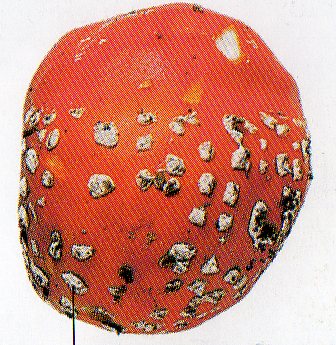 Kapa, dok je u formi lopte, pokrivena je bijelom membranom, potom se potpuno izravna pokrivena svijetlo crvenom kozicom istackanom bijelim ili zutim bradavicama koje kod mladjih gljiva pokrivaju veci dio povrsine kape. Kako gljiva stari tako se broj bijelih bradavica smanjuje I mogu se lakse otresti sa kape. Kod starih gljiva bijele bradavice nestanu u potpunosti a boja koze kape postane svijetlo narandjasta.Rese ispod kape su zgusnute, slobodne I siroke. Bijele ili krem.