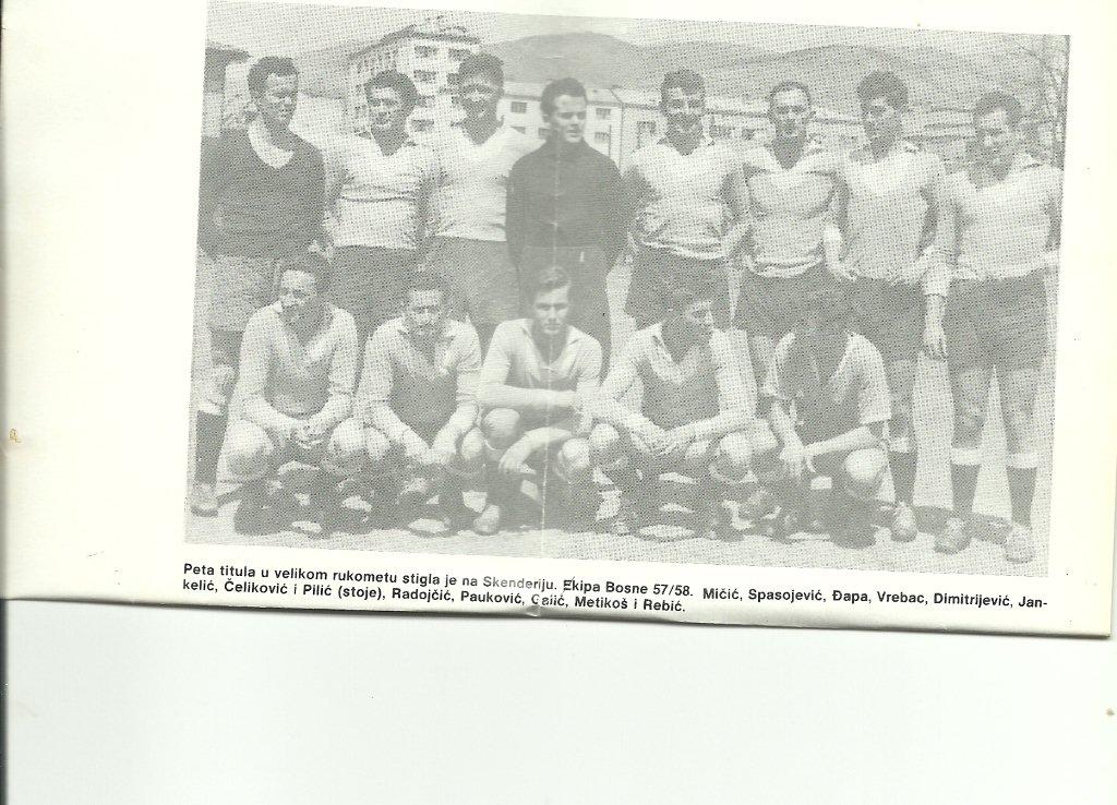 Slika pripada sportskoj proslosti poligona “Skenderija” i svjedocanstvo je visokih dometa ekipe Rukometnog kluba “Bosna” ( koji se ranije zvao “Milicionar”), iz Sarajeva, ciji clanovi su svi redom postali sportske zvijezde, popularni likovi i imena i danas u funkciji predstavljanja amaterskog sporta, ljudske dobrote i cestitosti.