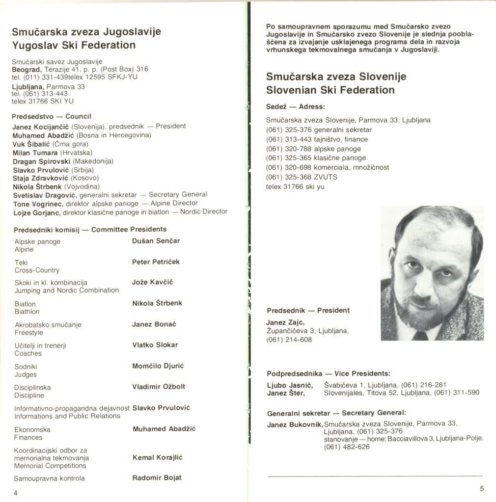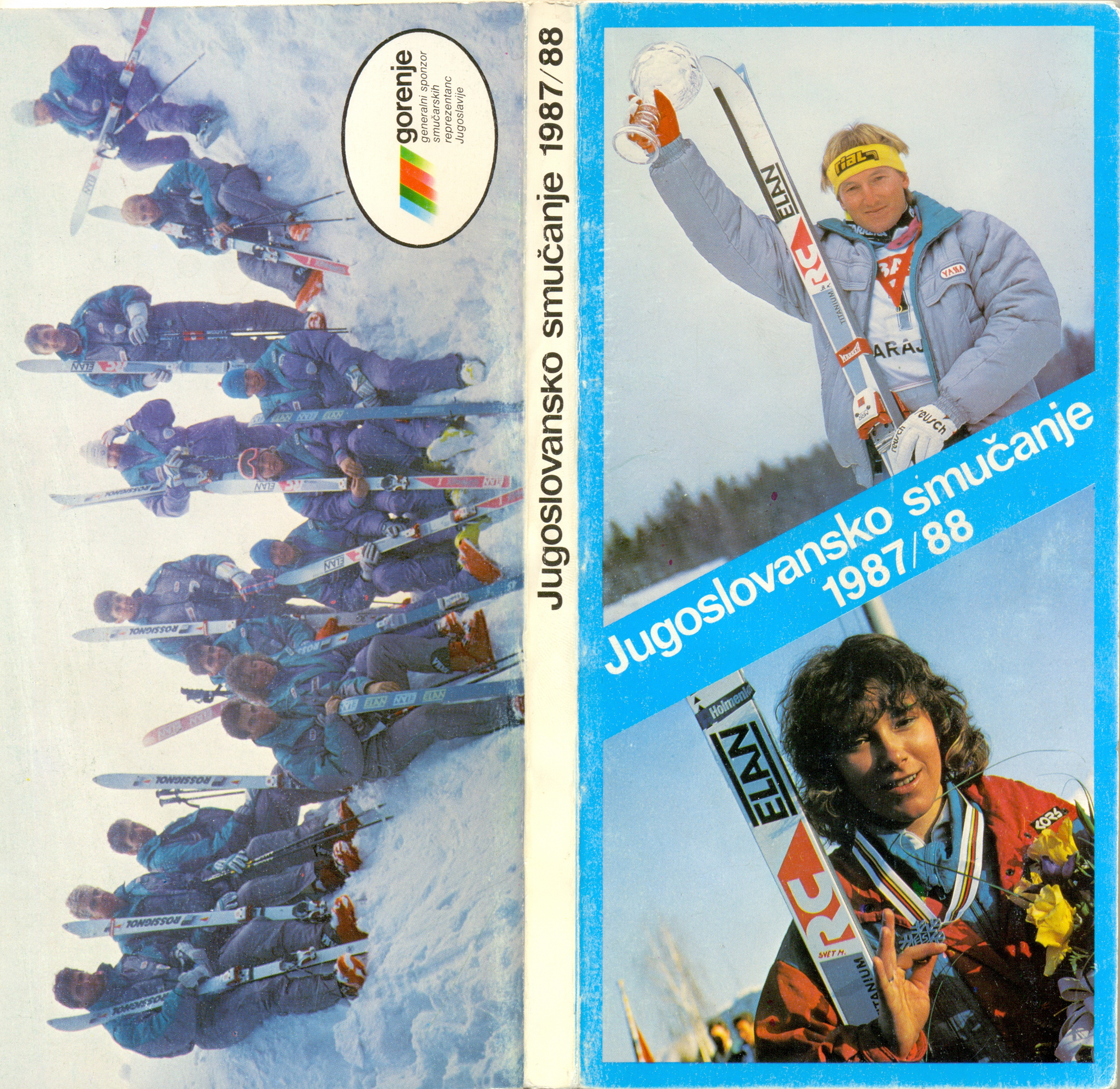Materijal je, u skladu sa ranijom sportskom praksom, izradjen za potrebe promocije reprezentativnih selekcija Smucarskog saveza Jugoslavije pred njihov nastup na XV Zimskim Olimpijskim Igrama 1988.godine u Kalgariju, Kanada.Uz sve zanimljivosti koje se u njemu mogu naci, interesantne su i liste pobjednika prvenstava Jugoslavije u svim smucarskom disciplinama.