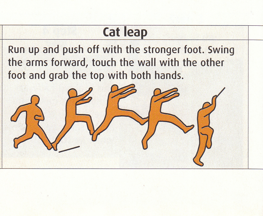 3. Cat leap: Potrci naprijed I odrazi se sa jace noge uvis.Ispruzi ruke naprijed, dotakni zid suprotnom nogom I uhvati gornju ivicu zida sa obje sake.