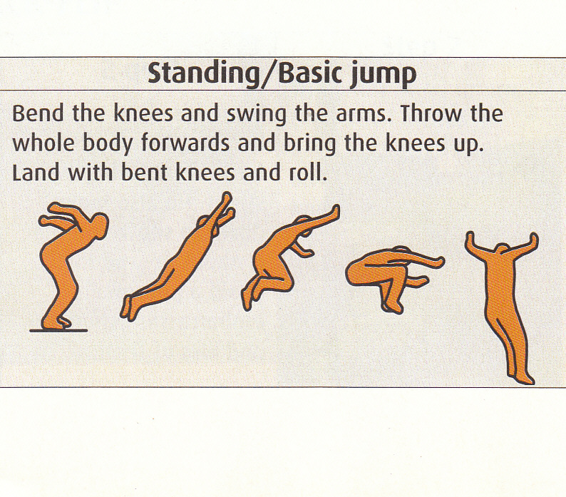 2. Standing/Basic jump: Savij koljena I zabaci ruke unazad.Odbaci cijelo tijelo prema naprijed I povici koljena uvis.Prizemlji se savijajuci koljena I praveci “kolut naprijed” preko jednog od ramena.