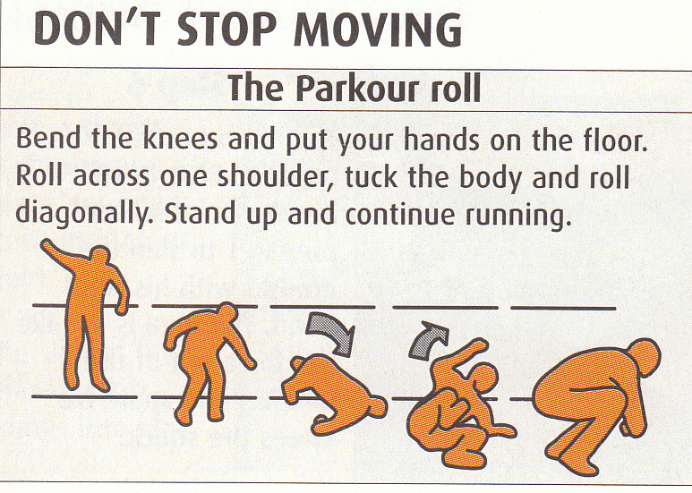 1. Parkour rol:Savij koljena I postavi dlanove na tlo.Prevrni se preko jednog ramena,presavij tijelo I zarolaj se dijagonalno.Ustani se I nastavi sa trcanjem;