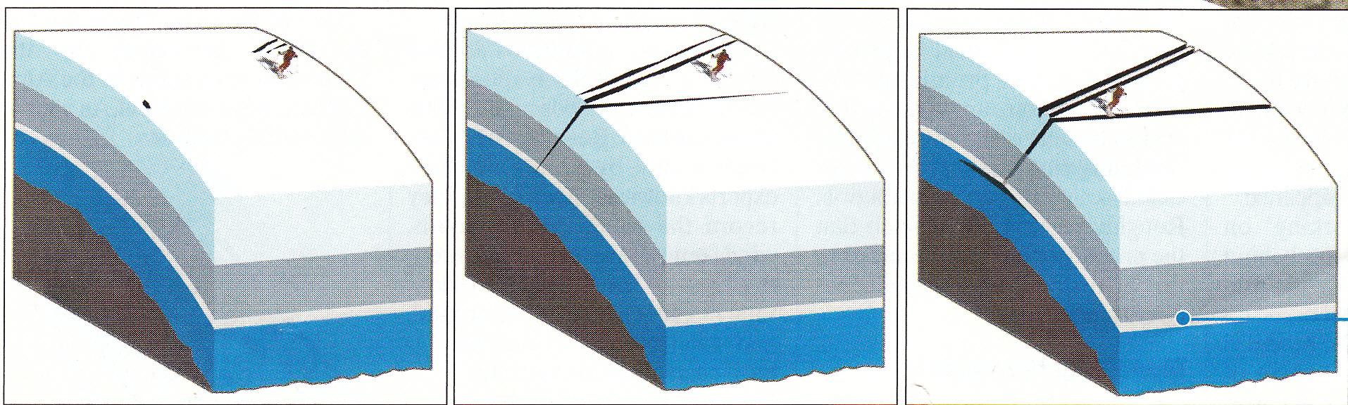 - Kako se skijas krece dalje prema naprijed, njegova tezina uzrokuje manja napuknuca na povrsini a potom veca duboko u slojevima snijeznog nanosa cijelom sirinom staze;