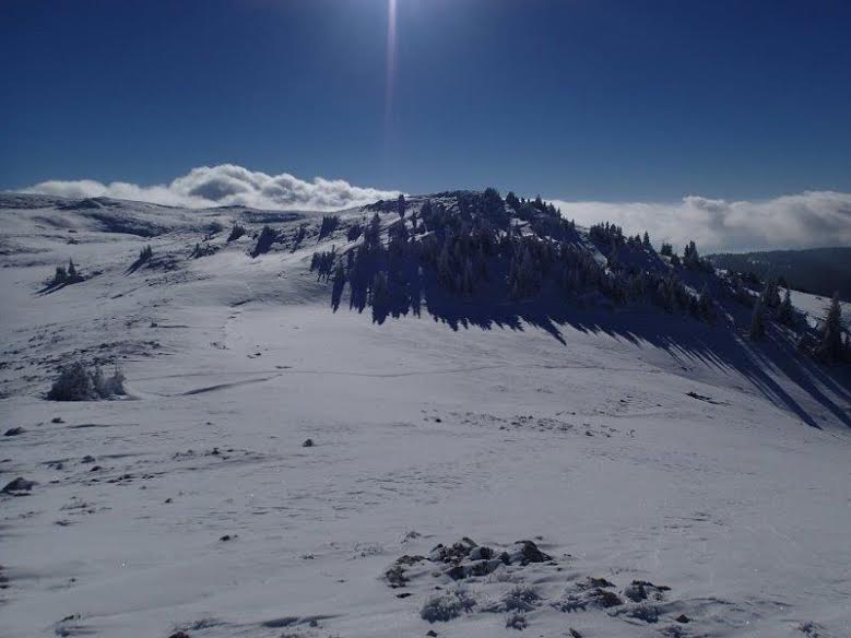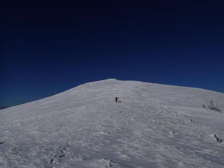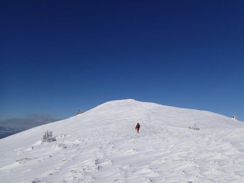 Kako smo se teško probijali kroz duboki snijeg, sada nam se smiješno čini penjati se pješke, sa skijama na leđima, jer je jaki vjetar otpuhao snijeg sa kamenom pokrivenih padinama prema vrhu.