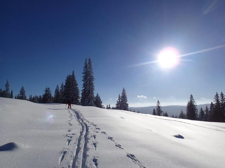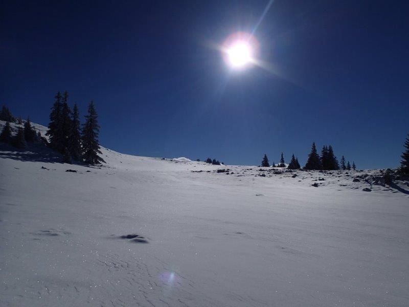 Ostali bi mi kod ovog pravog domaćina Pave dugo, ali njegove sjevero-zapadne padine nas mame da se spustimo po njima, po djevičanski nedirnutom, dubokom snijegu. Skidamo kože sa skija, učvršćujemo vezove i pancerice, pakiramo opremu i konačno uživamo u spustu ostavljajući vijugave tragove po leđima našeg prijatelja Pave. Snijeg je malo predubok, mekan, tako da ne možemo razviti punu brzinu, iako ima i strmih dijelova.