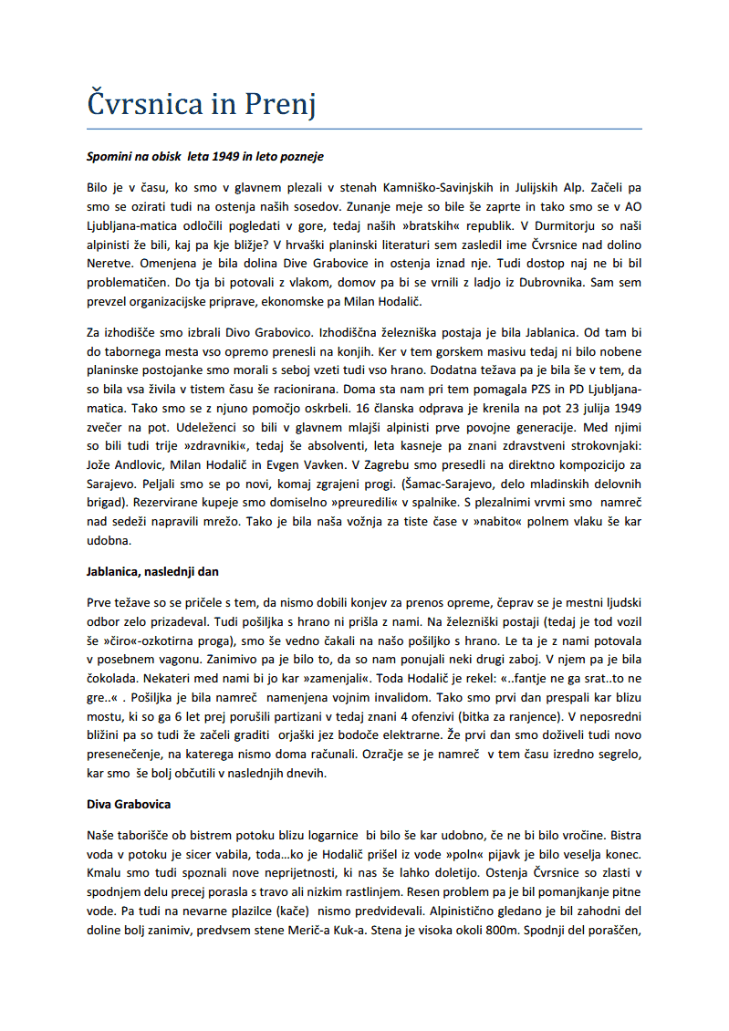 U masivu Čvrsnice slovenački alpinistu su bili u ljeto 1949. (prvi članak), koristeći informacije hrvatskih alpinista nakon njihovih posjeta Čvrsnici, 1939. i 1941. g. (članci i opisi uspona objavljeni u “Hrvatskom planinaru”), te u septembru 1950.