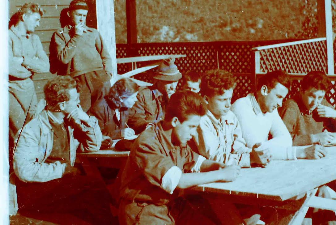 1. slika: Tečajci na teoretskoj nastavi na Boračkom jezeru; u prvom redu, prvi slijeva je Hidajet Haračić-Hari (malo zatim poginuo prilikom penjačkog uspona u stijenama poviše Babinog zuba na Darivi); u drugom redu (sa šeširom) je Drago Entraut. Pozadi su (stoje) slovenački instruktori.