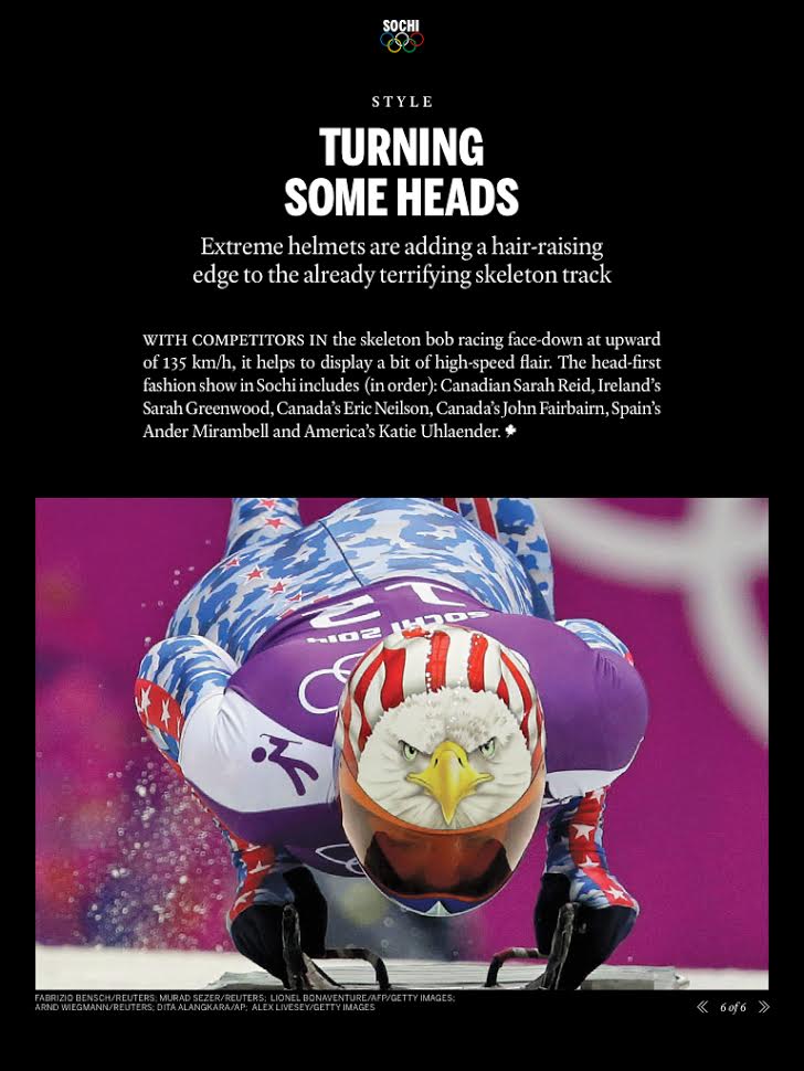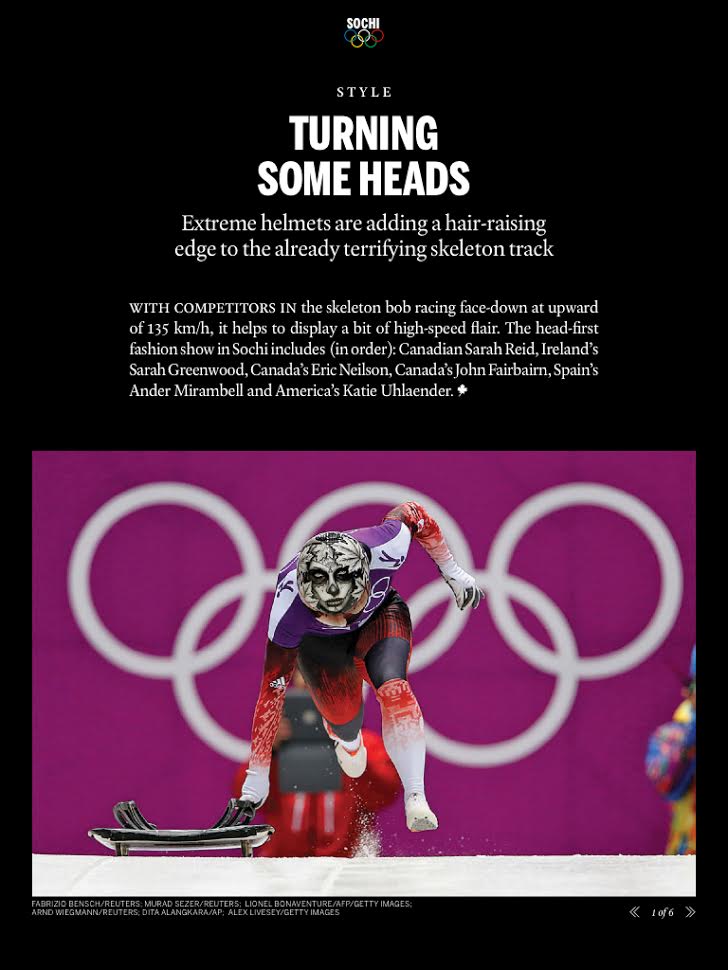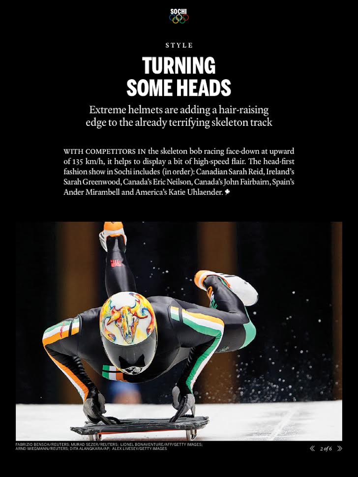 Mi na blogu imamo jedan zanimljiv post sa slikama zastitnih kaciga razlicitih formi i oblika. Ovaj prilog opet je posvecen sportskim kacigama i njihovoj zacudjujucoj ljepoti. Moze se reci da je svaka od ovih kaciga koje su nosili sankasi na takmicenjima zadnjih Zimskih Olimpijskih Igara 2014. u Sochy-u (RUS), izvanredno malo umjetnicko djelo.Lica sportista, takmicara u skleletonu, okrenuta su prema dole, tako da su u prvi plan usli crtezi sa njihovih kaciga.