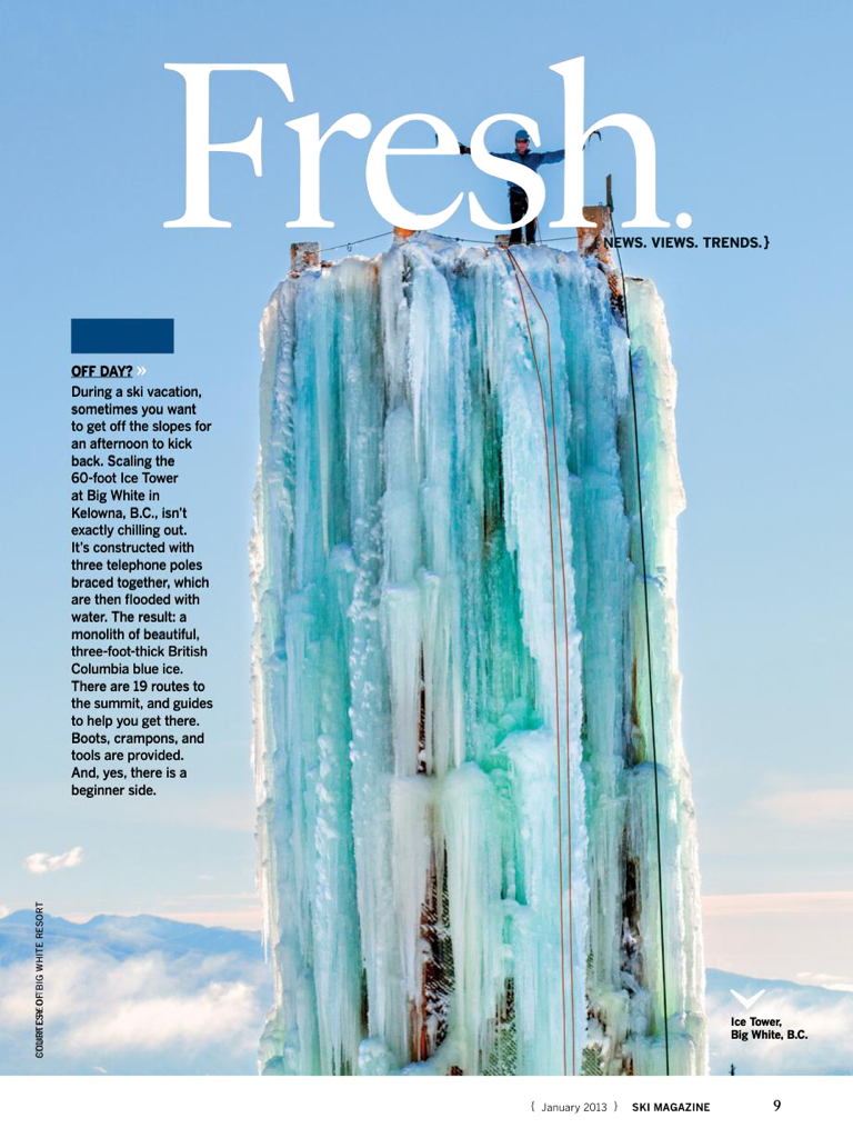 Tokom skijaskog raaspusta, ponekad pozelite provesti dan van smucarskih staza. Penjuci se na 18 metara visok ledeni toranj na Big White u Kelovni, BC nije bas naivna rekreacija. Toranj je konstruisan od tri telefonska stuba naslonjena jedan na drugi a potom obilno polivena vodom. Rezultat je monolitni i prelijepi tronozni komad plavog leda debljine oko 1 m (3 foot).