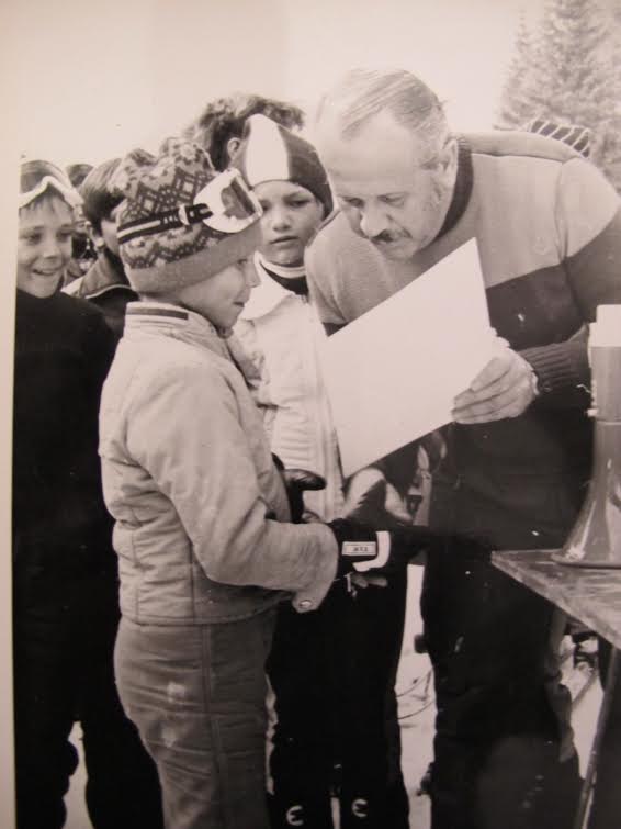 Na fotosu dodijeljuje prvu pobjednicku diplomu cicibanu (buducem prof. dr.) Ilji DORSNERU 1981. na Kupu TOPER na “opasnom” veleslalomu iznad doma PARTIZAN.