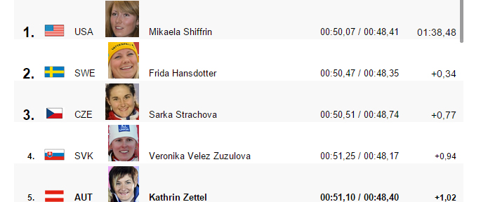 Druga je bila švedanka Frida Hansdotter, dok se na treću poziciju plasirala čehinja Sarka Strachova.