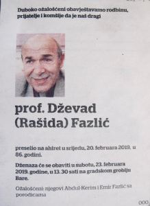 20.02.2019. u 86. godini života zauvijek nas je napustio vedri i razgovorni prof. Dževad Fazlić i sahranjen je na sarajevskom groblju Bare.