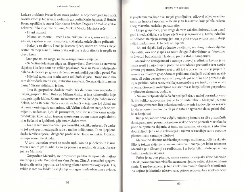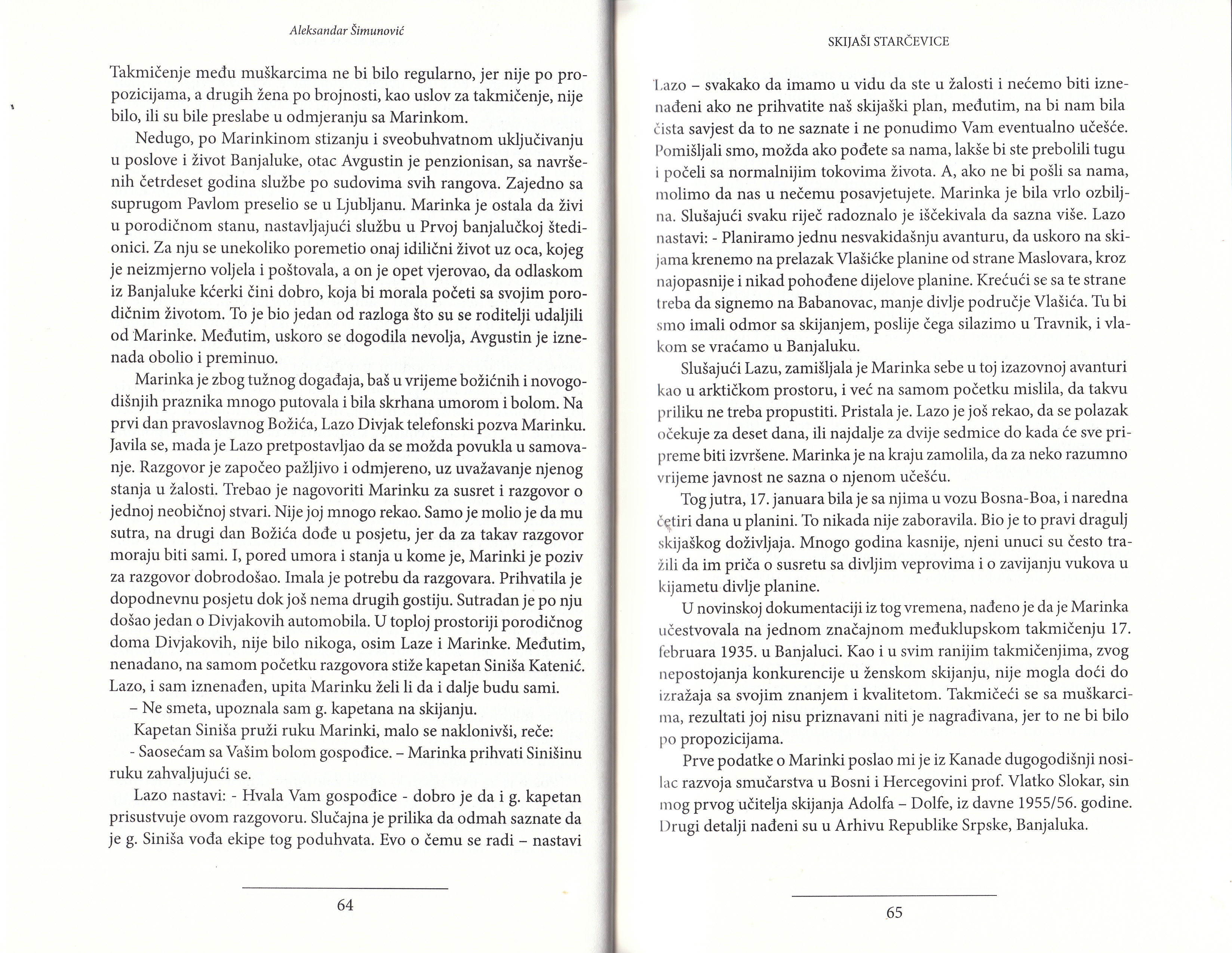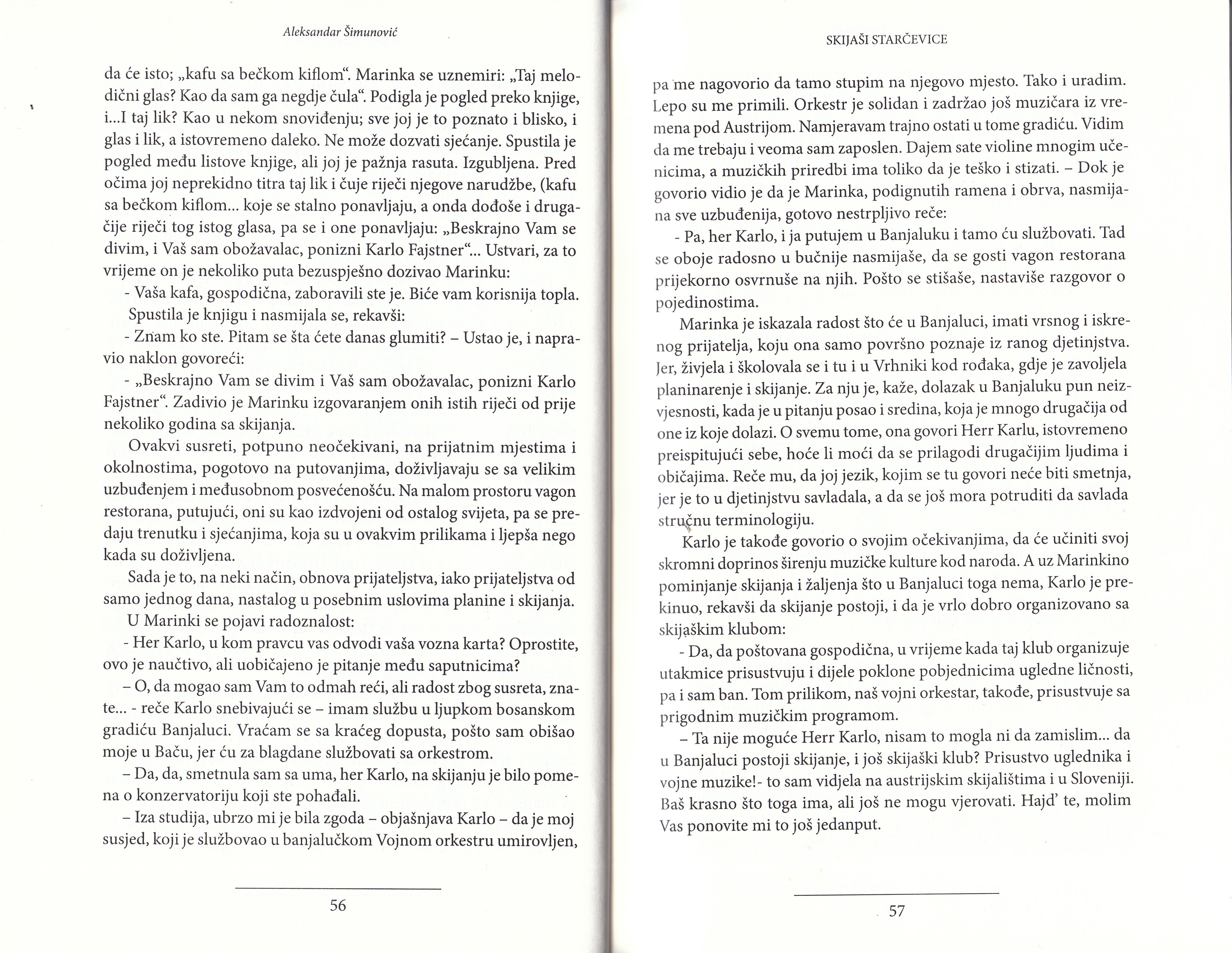 Nedavno je iz štampe izašla knjiga “Skijaši Starcevice” u kojoj je autor Aco Šimunović iz Banjaluke objavio i nekoliko lijepih i toplih priča koje, osim sto govore o putevima razvoja skijanja u ovom kraju, uvijek oživljavaju i nekog od junaka koji je zaslužio da bude zapamcen, ustvari, nekoga od ljudi koji su neizmjerno volili skijanje i planine i svojim angazovanjem pomogli da se razvije i dugi niz godina odrzi smucarska aktivnost u Banja Luci i njenoj okolini. Koliko ljubavi i strasti prema snijegu, druzenju i Starcevici je stalo u Acine divne price!