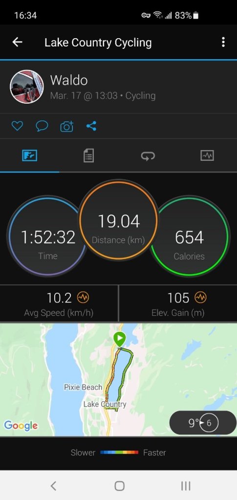 Na početnoj tački čekali su me supruga i sin sa 0.5 litara Stiegl piva i Quest protein barom. Dan je bio prekrasan, topao. Uživao sam. Lijepo je biti penzioner!