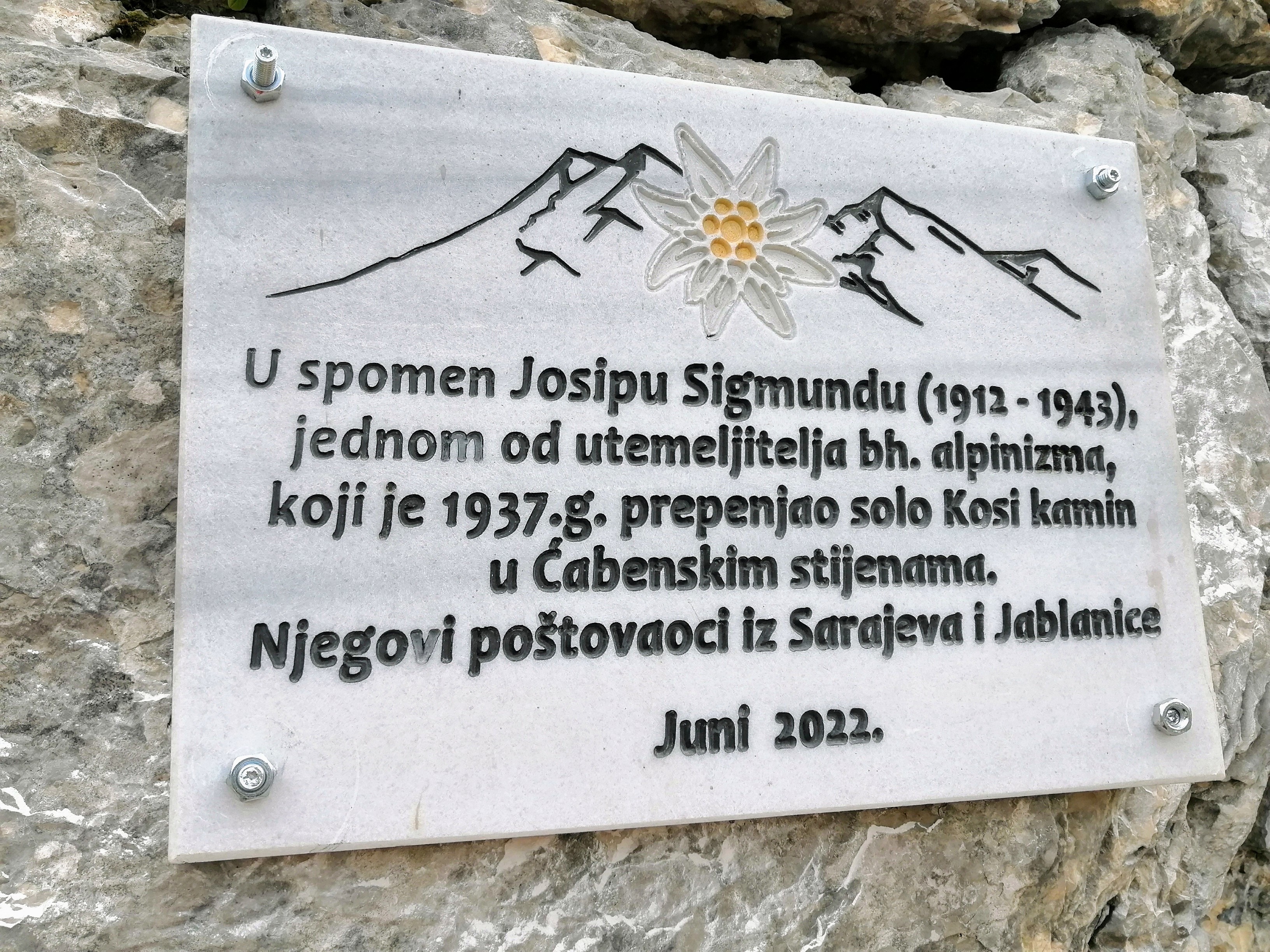 Postavljanje spomen-ploče Josipu Sigmundu, jednom od trojice glavnih utemeljitelja bh. alpinizma — 23. septembar 2023. (ispod Suhe lastve, pored markirane staze koja vodi ispod Nikolinih stijena prema Bijelom jezeru), na mjestu odakle se otvara pogled na Ćabenske stijene) : Zaim Begaj, Redžep Grabus, Nemanja Hrnjez, Slobodan Žalica.